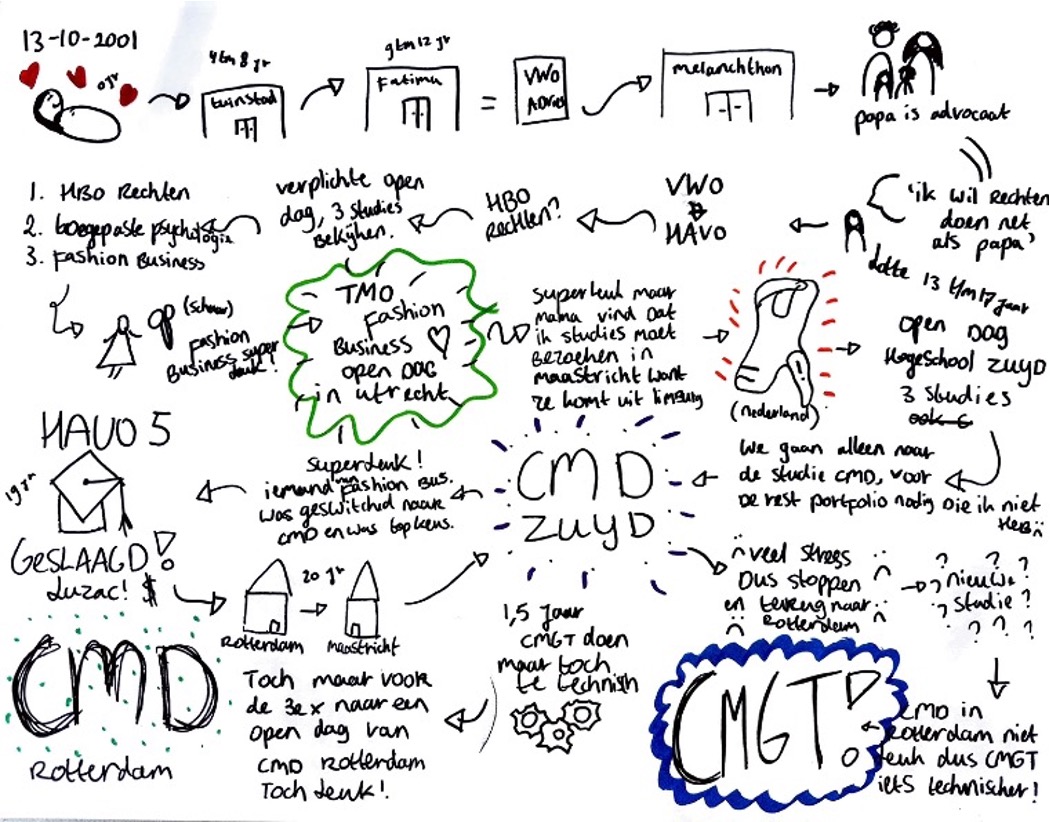 Nadat ik mijn HAVO diploma haalde verhuisde ik naar Maastricht om aan de Hogeschool ZUYD CMD te studeren. Maastricht was super leuk en ik vond de studie ook geweldig, maar ik had heel veel stress van de verhuizing. Mentaal ging het minder met mij waardoor ik steeds minder naar school ging en werd geforceerd om te stoppen met de studie. Ik verhuisde weer terug naar Rotterdam bij mijn ouders en had een tussenjaar. Natuurlijk moest ik een nieuwe studie vinden dus ging ik weer naar open dagen dit keer in Rotterdam. Ik keek bij CMD in Rotterdam maar ik vond het echt niks en wilde graag iets wat technischer doen. Hierdoor kwam ik uit bij Creative Media & Game Technologies. Wederom begon ik deze studie en begon het best goed. In jaar twee begon de studie wel erg technisch te worden en bleef er niet veel over van de creativiteit, hierdoor na lang nadenken stopte ik toch ook met deze studie. Dus ging ik voor de derde keer naar de open dag van CMD Rotterdam! Dit keer vond ik de open dag best wel leuk en interesseerde de studie mij wel, ik schreef me in en begon aan de studie. Op dit moment zit ik al dik een half jaar op de studie en ben ik nog steeds tevreden met mijn keuze!